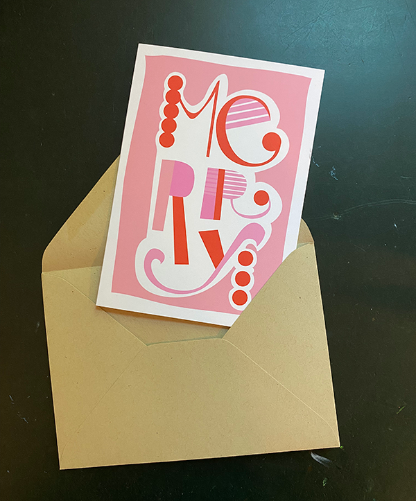 5 Pack of festive "Merry" cards. 4.24" x 6" cards & envelopes