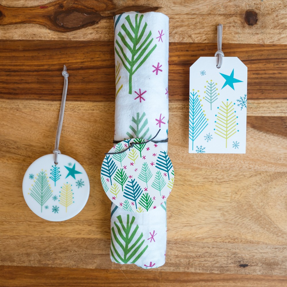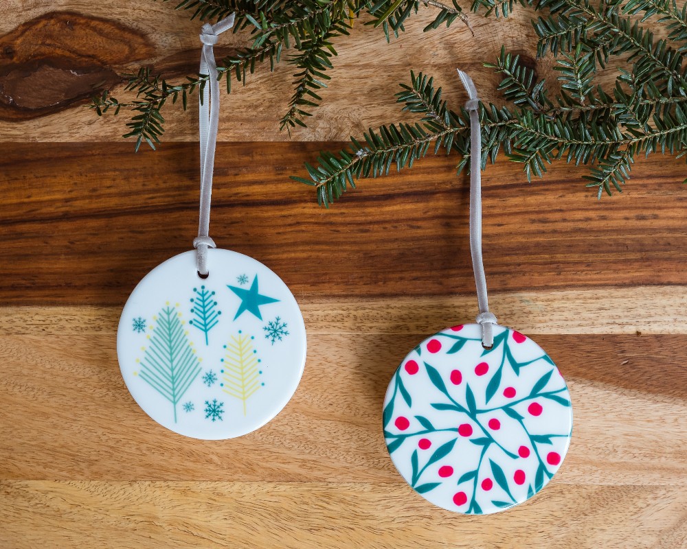 These 3" ceramic ornaments bring a modern, hand-drawn twist to your holiday decor—choose from contemporary evergreens with delicate snowflakes or branches and berries, each design full of quiet beauty and festive spirit.