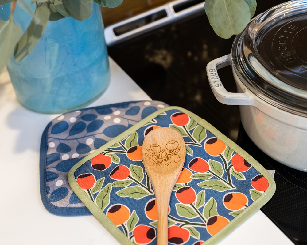 Keeps your hands protected on hot pots and keeps counters from scorching. This hot pad turns everyday cooking into an artful ritual with vibrant rose hips and hand-drawn charm.
