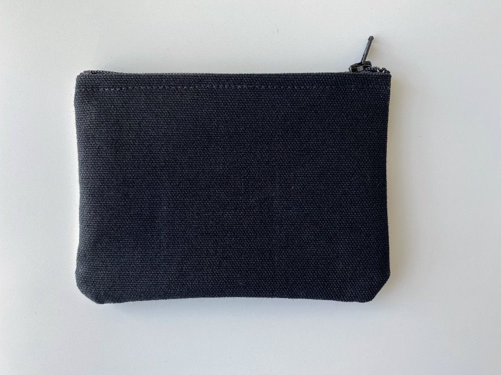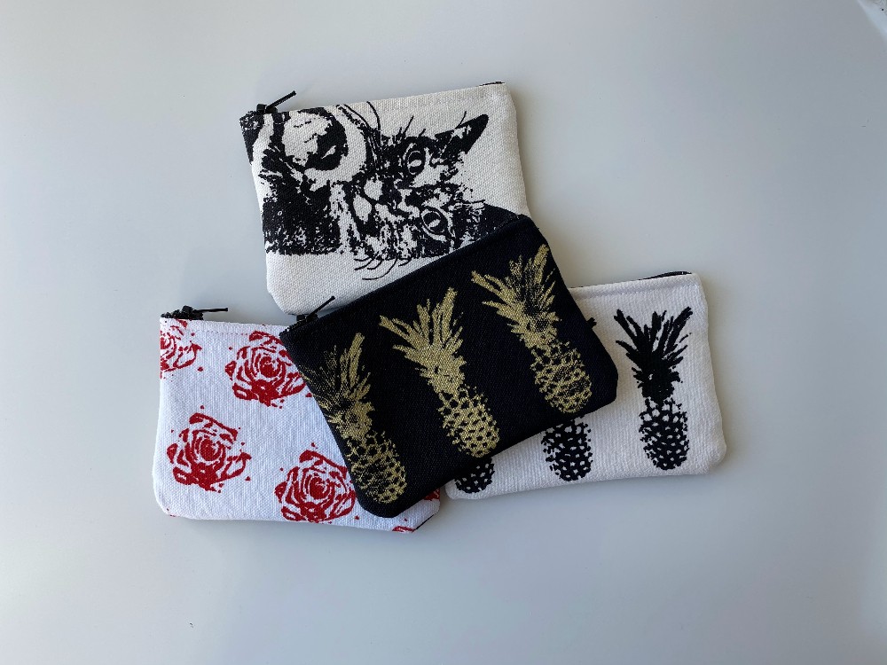 Plastic lined mini zipper pouch featuring original screen printed designs. Fits credit cards, cash, keys, and other small items.